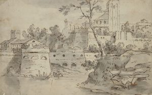 École FRANÇAISE du XVIIe siècle Paysage à la ville fortifiée Plume et encre noire, lavis gris. Porte en bas à droite le cachet de la collection E. Calando (Lugt n°837) et au verso le cachet de la collection Robelot (Lugt n°2141). 19 x 30 cm