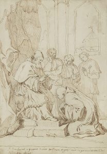 Attribué à Pier Leone GHEZZI (1674 - 1755) Scène de la vie de Saint Bruno Plume et encre brune. Porte une inscription en bas S. Bonifacius a Gregorio secundo Missionem et predicandi in germania verbi dei facultatem obtinet. (Au dos, Étude de...