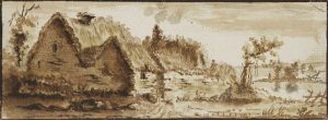 École HOLLANDAISE du XVIIe siècle Paysage aux deux chaumières et à l’étang Lavis brun et gris. 10 x 28.6 cm
