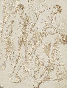 Giovanni Paolo PANINI (Plaisance 1691 - Rome 1765) Étude de trois hommes devant une échelle Plume et encre brune. Porte en bas à gauche le cachet de la collection E. Calando (Lugt n°837). Porte au verso du montage une inscription traditionnelle...