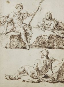 Giovanni Battista SASSI (Actif à Milan entre 1713 et 1747) Étude de bergers Plume et encre brune. Porte une inscription au verso Cavagliere Gio. Batt Sassi / Milanese. 20.8 x 15.4 cm