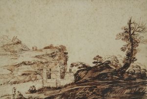 École ITALIENNE du XIXe siècle, dans le goût du GUERCHIN Paysage aux pêcheurs Plume et encre brune. (Rousseurs). 26 x 40 cm Provenance : - Vente anonyme, Paris Hôtel Drouot, 17 juin 1968, n°30, reproduit. - Vente anonyme, Paris Hôtel Drouot...