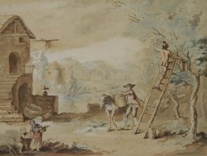 École FRANÇAISE du XVIIIe siècle La Cueillette des pommes Plume et encre brune, lavis brun et aquarelle. 29.5 x 39 cm