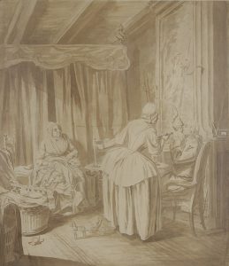 École FRANÇAISE de la fin du XVIIIe siècle Scène domestique Plume et encre noire, lavis brun. 45 x 38.5 cm