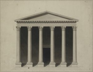 Antoine Laurent Th. VAUDOYER (1756-1846) Élévation du temple de Minerve à Assise Plume et encre noire et grise, lavis noir et gris. Titré en haut à droite Élévation du temple de / minerve a Assisi. Porte au verso le cachet A. L. T. Vaudoyer...