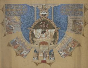 Henri PINTA (Marseille 1856 - Paris 1944) Projet de mosaïque pour la coupole du Sacré-Cœur de Marseille Aquarelle et rehauts de blanc, traits de crayon noir, sur papier beige. Annoté. 63 x 80 cm Prix de Rome en 1884, Henri Pinta travailla...
