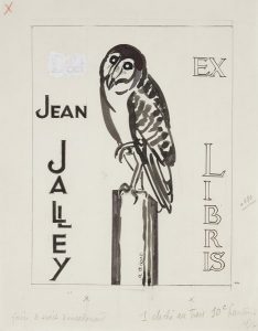 Raymond BIGOT (1872-1953) Chouettes perchées. Trois feuilles d’études pour l’ex-libris du docteur J. Jalley, 1945 3 dessins au pinceau et à l’encre de chine avec traits de mine de plomb sur vélin mince, un avec petite correction à la...