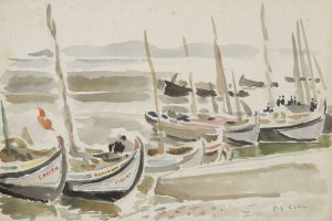 Paul-Émile COLIN (1867-1949) Barques au port, Lisbonne Aquarelle sur vergé. Signée en bas à droite à la mine de plomb. (Infimes rousseurs). 17.5 x 25.7 cm