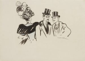 Pierre-Georges JEANNIOT (1848-1934) Le Jardin du Fronton de [illisible] - Deux hommes et une femme, vers 1900 2 dessins de presse. Lavis d’encre de chine, gouache blanche et crayon bleu sur vélin. Signés. Le 1er annoté en vue de sa reproduction...