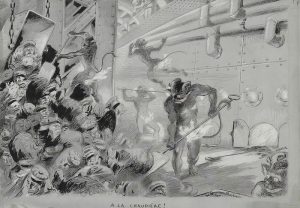 Adolphe-Léon WILLETTE (1857-1926) A la chaudière Dessin à l’encre et grattage sur papier strié. Signé en bas à droite. Titré en pied. 35 x 48.5 cm Notre dessin fut reproduit dans L’Assiette au Beurre n°123 du 8 août 1903.