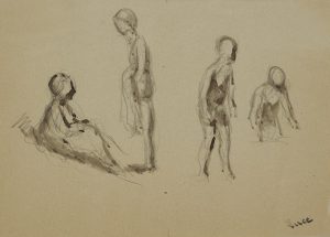 Maximilien LUCE (1858-1941) Étude de femmes à la plage Dessin au lavis sur traits de crayons. Porte le cachet de la signature en bas à droite. 16.5 x 22.5 cm