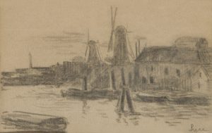 Maximilien LUCE (1858-1941) Port en Hollande, vers 1908 Fusain. Signé en bas à droite. 12.5 x 20 cm