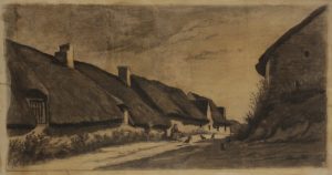 Karl DAUBIGNY (1846-1886) Chaumières à Auvers Dessin au crayon noir. Monogrammé en bas à droite. Annoté et titré. (Déchirures et restaurations). 46 x 83 cm