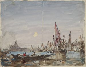 Amédée ROSIER (1831-1898) Venise, barques et bateaux sur le Grand Canal le soir Aquarelle. Porte le cachet de la vente de l’atelier en bas à gauche (Lugt 2149a). 17.5 x 22.5 cm