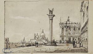 Amédée ROSIER (1831-1898) Venise, la piazzetta et la Salute Dessin à l’encre et lavis d’encre. Porte le cachet de la vente de l’atelier en bas à gauche (Lugt 2149a). 12.5 x 21.5 cm