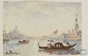 Amédée ROSIER (1831-1898) Venise, le Grand Canal sous le soleil Aquarelle sur trait de crayon noir. Signée en bas à gauche. Porte le cachet de la vente de l’atelier en bas à droite (Lugt 2149a). 12.5 x 18 cm