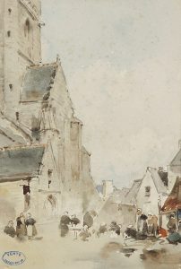 Amédée ROSIER (1831-1898) Rouennais, marché place de l’église Aquarelle. Porte le cachet de la vente de l’atelier en bas à gauche (Lugt 2149a). (Petites rousseurs). 27 x 18 cm