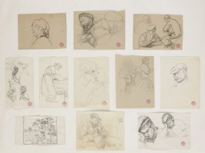 Lucien OTT (1870-1927) Études de personnages 11 dessins à la mine plomb. 9 portent le cachet rouge de l’artiste. 2 monogrammés. (Collés sur un même montage). Environ 11 x 15 cm chaque