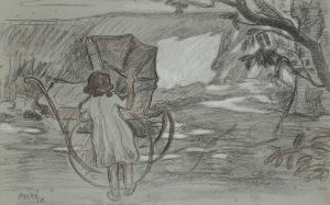 Jean Misceslas PESKE (1870-1949) Fillette au landau, 1910 Dessin à la pierre noire, sanguine et craie blanche. Signé et daté en bas à gauche. (Petite déchirure). 31 x 48 cm