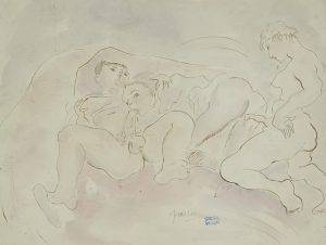 J. Pincas dit PASCIN (1885-1930) Scène érotique Dessin à l’encre et aquarelle. Signé en bas à vers la droite. Porte le cachet de la vente de l’atelier. 24 x 32 cm