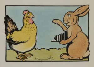 Benjamin RABIER (1869-1939) La Poule pose pour le Lièvre Dessin à l’encre et aquarelle. Signé en bas au milieu. On joint la plaquette publicitaire pour la Galerie de Photographie d’Art Mertens-Auradon, 95 avenue Mozart, Paris, reprenant le...