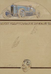 Georges HAMEL dit Géo HAM (1900-1972) Voiture de course et portrait du pilote François Repusseau, vers 1921-25 Dessin à l’encre, aquarelle et rehauts de gouache. Signé en bas vers la droite. Planche réalisée en l’hommage de François...