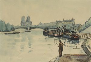 André DUCULTY (1912-1990) Paris, l’entrée du port de l’Arsenal et Notre-Dame Aquarelle. Signée en bas à droite. 18.5 x 26 cm