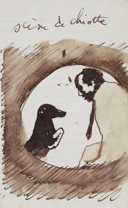 Roland TOPOR (1938-1997) Scène de chiotte Dessin à l’encre brune et lavis. Titré en haut. 15.5 x 9.5 cm