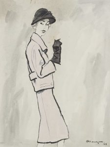 Pierre MOURGUE (1890-1969) Tailleur rose pour Guy Laroche, printemps 1958 Dessin à l’encre et gouache. Signé et daté en bas à droite. (Petits accidents sur les bords). 55.5 x 38 cm
