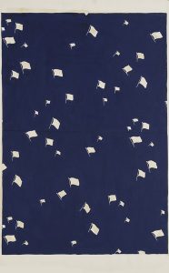 Maison BIANCHINI-FERIER (vers 1920) Projet de tissu, motifs de drapeaux blancs sur fond bleu Gouache sur vélin. 99 x 63 cm