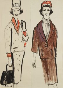 Bernard BLOSSAC (1917-2001) Deux tailleurs, Étude pour Vogue, Chanel n°2 Dessin à l’encre et gouache. Signé en bas à gauche. (Frippures et plis). 62 x 46 cm