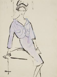 Bernard BLOSSAC (1917-2001) Modèle tailleur mauve (Magazine Actualité Couture 1955) Dessin à l’encre et gouache. Signé en bas à gauche. (Petits plis). 59 x 44 cm