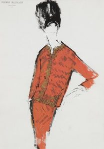 MAISON Pierre BALMAIN Projets de tenues 2 dessins à l’encre et gouache. Sur un papier à entête de la Maison Pierre Balmain. 31 x 25 cm chaque