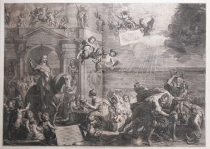 Gravure sur cuivre, 95 x 134. Entoilée. Sous verre, dans un cadre noir. Gravure en quatre parties. Quelques petites restaurations,, sinon fraîche et en belle condition. Gravure allégorique : de nombreux angelots dans le ciel, et des personnages divers entourent et précèdent l'archiduc. Des textes (en latin), sont gravés sur la muraille ou se trouvent dans des cartouches. L'archiduc Léopold Guillaume de Habsbourg (1614-1662) fut gouverneur général des Pays-Bas méridionaux catholiques de 1647 à 1656. Il était le fils cadet de Ferdinand II de Habsbourg.