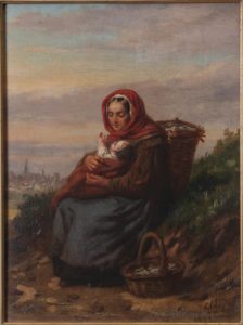 Huile sur panneau, 26 x 20. Signée et datée «Henri Dillens. 1872» en bas à droite. Dans un cadre doré. Peintre de scènes de genre et lithographe né à Gand en 1812 et mort à Ixelles en 1872. Il réside à Anvers, puis à Bruxelles (Arto). Sujet : Halte d'une femme et de son nourrisson au bord du chemin.