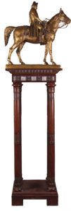 Bronze, patine dorée. Hauteur au chapeau : 45 cm (hauteur du socle : 5 cm). Longueur : 60 cm. Poids : 24 kg. Signature «Morise» au socle. Médaille avec légion d'honneur «Bronze garanti authentique Paris» au socle. Œuvre posée sur un socle (pivotant) en bois sculpté dans le style «retour d'Egypte» éventuellement fourni à l'origine (hauteur : 120 cm). Ensemble en très belle condition. Le sculpteur Louis Marie Moris (ou Morise) naquit à Paris en 1818 et y mourut en 1900. Elève d'Alexandre-Victor Lequien (1796-1881) et de James Pradier (1792-1852), il exposa au Salon de 1857 à 1869. La présente statue équestre de Napoléon If reproduite à Paris, et vendue avec la possibilité d'acquérir en même temps le socle que nous proposons à la vente. Le présent ensemble a orné le Pavillon de la France à l'Exposition Internationale de Liège de 1905. A l'issue de l'exposition, il fut acquis par le Liégeois Auguste Thiriart, fondateur des célèbres magasins liégeois «Au Grand Bazar», Place Saint- Lambert, en face du Palais des Princes-Evêques.