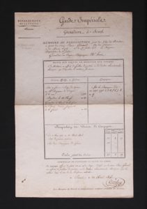 [Premier Empire]. Garde Impériale. Grenadiers à cheval. Mémoire de proposition pour la solde de Retraite. Signé notamment par le maréchal Bessières et du général Ordener. 1806.