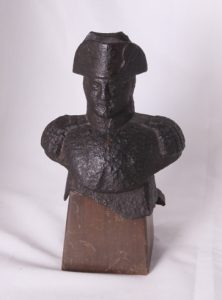 Fonte. Hauteur : 19 cm. Manque une partie de la base. Monté sur un socle de bois. Buste traditionnel, avec le chapeau et les épaulettes.