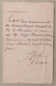 Billet de recommandation à l'en-tête «Le Maréchal Foch», par lequel il présente M. Rizzo-Waroux, agent commercial (21 x 12,8). Sous verre, baguette de bois ciré. En bonne condition.