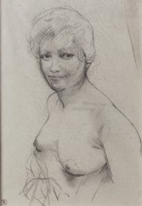 Dessin à la mine de plomb sur papier légèrement bleuté, 19,5 x 13,5. Cachet postérieur en bas à gauche. En belle condition. Sous verre et passe-partout, baguette argentée.