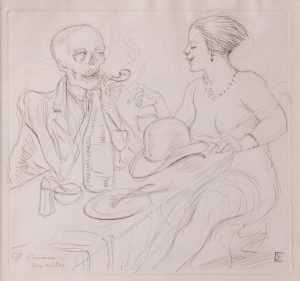 Plume, 14,3 x 15,4, coins arrondis. Epreuve sur Japon 16 x 17. Titrée «l'inconnu sans oreilles» de la main de Rassenfosse en bas à gauche. 1er état sur 3 (Rouir, 929). Un des deux ou trois exemplaires connus. Exemplaire en très belle condition. Sujet : jeune femme causant avec la mort.
