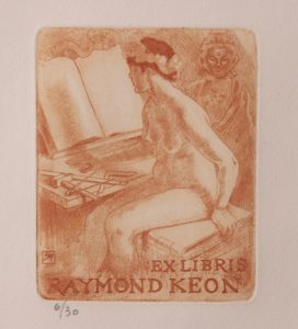 Estampe, 17 x 13. Epreuve sur Hollande 24 x 17,5. En bas, «Femme. 1910», et «Rassenfosse». Décharge au verso. Sous passe-partout (deux morceaux de scotch ont malheureusement servi à fixe la gravure). Sous verre, baguette dorée. Il s'agit sans doute d'un exemplaire d'une des suites de l'ouvrage. Joint : Armand RASSENFOSSE. Ex-libris Raymond Keon. Estampe, 11x 8,2. Marges : 21 x 15. Monogrammé dans la plaque. Justifié «6 / 3» au crayon en dessous à gauche. En très belle condition. Sous verre et passe-partout, baguette verte et noire.