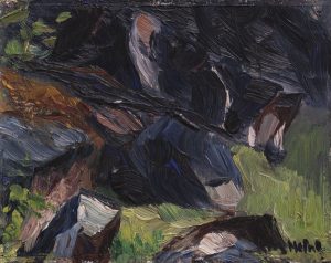 Huile sur carton fort, 19 x 23,8. Signée «Rich. Heintz» en bas à droite. Authentifiée au dos par Madeleine Orban-Heintz : «Les Blocs. Sy. Mai 1929. Rich. Heintz. Toile sur carton».