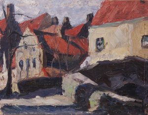 Huile sur carton fort, 19 x 24,5. Authentifiée au dos par Madeleine Orban-Heintz : «Soleil et ombres. Bruges. Mars 1927. R. Heintz».