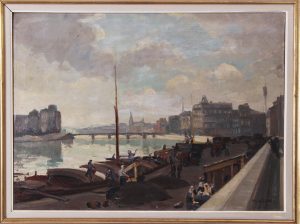 Huile sur toile, 55 x 75. Signée «M. de Lincé» en bas à droite. Titré «Quai de Maestricht» et contresigné au dos. Dans un cadre doré.