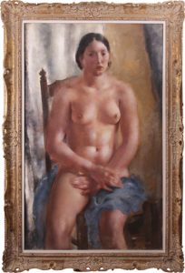 Huile sur toile, 130 x 81. Signée «Léon Devos» en bas à droite. Au dos, étiquette de la «XXI^ Internationale des Beaux-Arts de Venise 1938», complétée à la main : «Nu assis», propriétaire Léon Devos. Etiquette d'expédition La Continentale Menkès. Dans un cadre orné vieil or. Peintre post-impressionniste de nus, paysages, natures mortes, etc., né à Petit-Enghien en 1897 et mort en 1974. Etudie aux Académies de Mons et de Bruxelles (Arto).