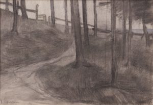 Dessin rehaussé de pastel (vert, bleu), 18,5 x 27,5. Signé «M. Pirenne» en bas à gauche. Sous verre et passe-partout, baguette de bois naturel. Frère de l'historien Henri Pirenne, né à en 1872 à Verviers, et y décédé en 1968. Essentiellement autodidacte. Dans les vingt dernières années de sa vie, il devient «le peintre des objets simples, isolés, conçus de ce fait comme signes de la solitude humaine» (Arto).