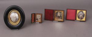 Portrait d'un homme. Daguerréotype ovale 7 x 5,5. Sous verre bombé (fendu), dans un médaillon ovale (1 7,5 x 15) de bois noir, passe-partout doré. Portrait d'un jeune homme au collier de barbe. Daguerréotype ovale 7 x 6. Sous verre 8 x 7, dans un étui brun foncé, fermoir. Portrait d'une dame âgée. Daguerréotype 8 x 7. Dans un étui brun foncé avec encadrement doré, fermoir. Portrait d'une dame. Daguerréotype 6,5 x 4. Dans un étui brun foncé avec encadrement doré. Quatre pièces en belle condition.