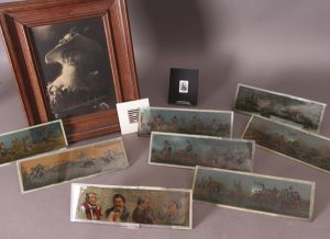 Photographie sur émail ovale faite selon le procédé de Lafon de Camarsac, 3,2 x 2,5. En très belle condition. Au dos, «Procédé Lafon de Camarsac. Médaille d'or 1867. Ladrey phot. passage des Princes. 9871» photographie du texte agrandi au dos du passe-partout. Pierre-Michel Lafon de Camarsac (1821-1905), présenta une technique d'émaillage et de rehauts des photographies à partir de 1855. L'Empereur Pierre II du Brésil (Bragance) naquit en 1 825 à Rio de Janeiro et mourut à Paris en 1 891 . Souverain à huit ans, il dut abdiquer en 1 889 et se réfugia en Europe. Joint : Henri BOTTIAU, phot. à Bruxelles. Faust (portrait). Tirage à l'huile, 27 x 19,5. Signée «Henri Bottiau» en bas à gauche. Sous verre, cadre en chêne d'origine (au dos du cadre, étiquette du quatrième salon international de photographie, Bruxelles 1902 - abîmée). Joint : [LANTERNE MAGIQUE]. 8 plaques pour «lanterna magica», 9 x 28. Joint : Pierre CORDIER. Petit chimigramme. 1979. 4,5 x 4. Sur carton 9,5 x 9,5, texte signé au verso. Photographe belge, inventeur du chimigramme.