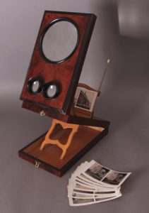 Boîtier en bois poli. Dimensions (refermé) : 35,5 x 22 x 9 cm; hauteur déployée : 56 cm. Sauf un décollement d'une partie de la face supérieure, en parfaite condition. On joint 1 0 photographie stéréoscopiques (huit de Liège, dont Exposition de 1905, et deux d'Ostende). La visionneuse stéréoscopique permettait de voir des photographies en relief.